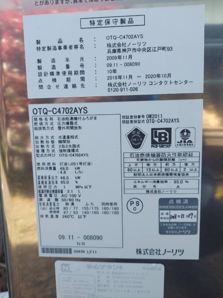 小松市 ノーリツ給湯器OTQ-C4702AYS→ノーリツ石油給湯機付ふろがまOTQ-4706AY 給湯器交換工事