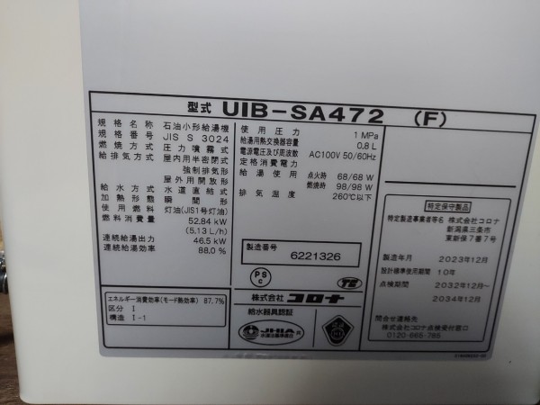 かほく市 コロナ石油小形給湯機UIB-SA472(F) 給湯器交換工事