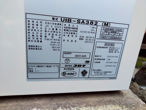 能美市大長野町 タカラスタンダード給湯器→コロナ石油小形給湯機UIB-SA382(M) 給湯器交換工事